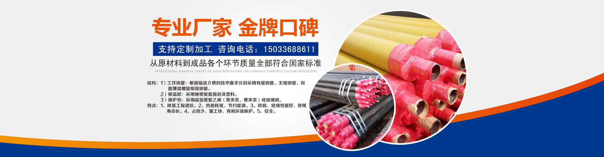 河北興松實(shí)業(yè)有限公司主營:預(yù)制直埋保溫管,鋼套鋼直埋保溫管,預(yù)制鋼套鋼保溫管,預(yù)制直埋熱水保溫管(件),預(yù)制直埋蒸汽保溫管(件),預(yù)制架空聚氨酯鍍鋅保溫管.公司自成立至今始終堅(jiān)持技術(shù)領(lǐng)先、服務(wù)到位的產(chǎn)品宗旨,建立了一支由高素質(zhì)的專業(yè)技術(shù)人員和企業(yè)管理人員構(gòu)成的企業(yè)運(yùn)營團(tuán)隊(duì)。我公司從國內(nèi)外引進(jìn)了大批先進(jìn)的生產(chǎn)、檢驗(yàn)設(shè)備,使企業(yè)的生產(chǎn)能力、生產(chǎn)規(guī)模、技術(shù)保障與質(zhì)量控制水平始終居于國內(nèi)同行業(yè)前列。